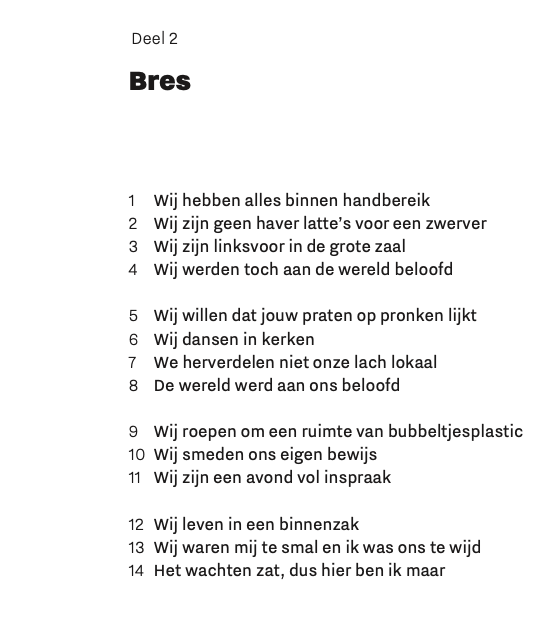 Deze achtergrond is nodig om een beeld te schetsen van een generatie die vervalt in onderlinge competitie. Succes is immers een keuze. Online is iedereen fit, rijk en gelukkig. Maak kennis met een generatie die alles zou kunnen worden, met een gebrek aan zelfspot, focus op identiteitspolitiek, die onwelgevallige meningen cancelt en geen onderlinge solidariteit kent. Bres is geïnspireerd op de gelijknamige bundel van Leonard Nolens, die zijn afstand tot zijn generatiegenoten van mei ’68 beschreef. Via deze link lees je het tweede deel van de bundel.